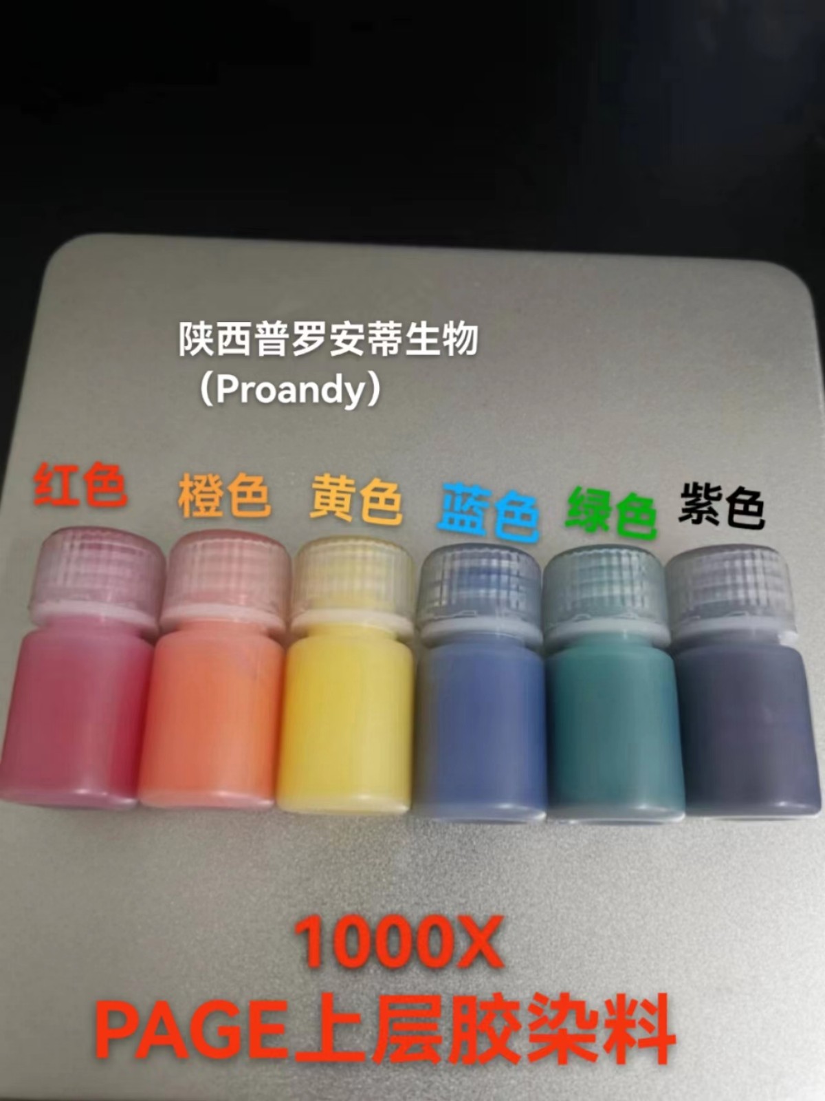 本品是本公司自主研發(fā)的PAGE 濃縮膠染料(Dye for PAGE Stacking Gel, 1000×)是一種用于配制聚丙烯酰胺凝膠濃縮膠(上層 膠、積成膠)的染料,該染料有紅、橙、黃、藍(lán)、綠、紫.........6種顏色可供選擇(可以定制其他顏色)。添加該染料可以使得濃縮膠蛋白 點(diǎn)樣孔一目了然,方便將蛋白樣品準(zhǔn)確無(wú)誤加入點(diǎn)樣孔中,易于判斷上樣孔邊距或是否歪曲破損。并且該 染料的顏色不會(huì)隨著電泳而進(jìn)入分離膠(下層膠),可穩(wěn)定的存在于濃縮膠中,電泳完成后也便于識(shí)別上層 膠并切除,不會(huì)影響電泳和染色效果。