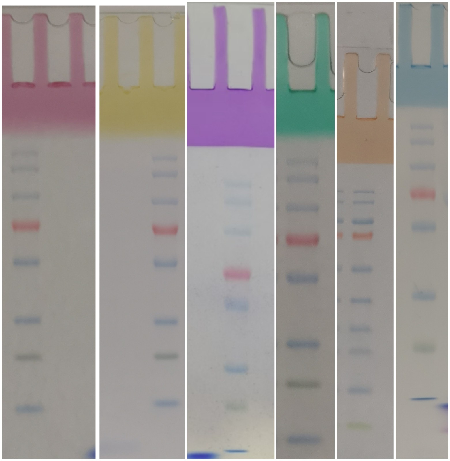 2. 由于經(jīng)常會(huì)出現(xiàn)不同樣本平行電泳多塊凝膠的現(xiàn)象,因此本公司同時(shí)提供多種顏色的濃縮膠染料, 包括紅色、橙色、黃色、藍(lán)色、綠色、紫色........(其他色可以定制)以用于區(qū)分不同樣本不同凝膠電泳。